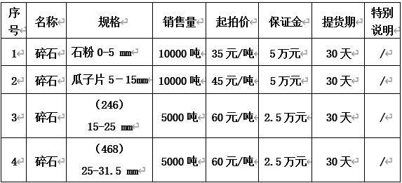 長(cháng)興南太湖投資開(kāi)發(fā)有限公司的碎石拍賣(mài),具體品種、數量、起拍價(jià)等詳見(jiàn)下表: